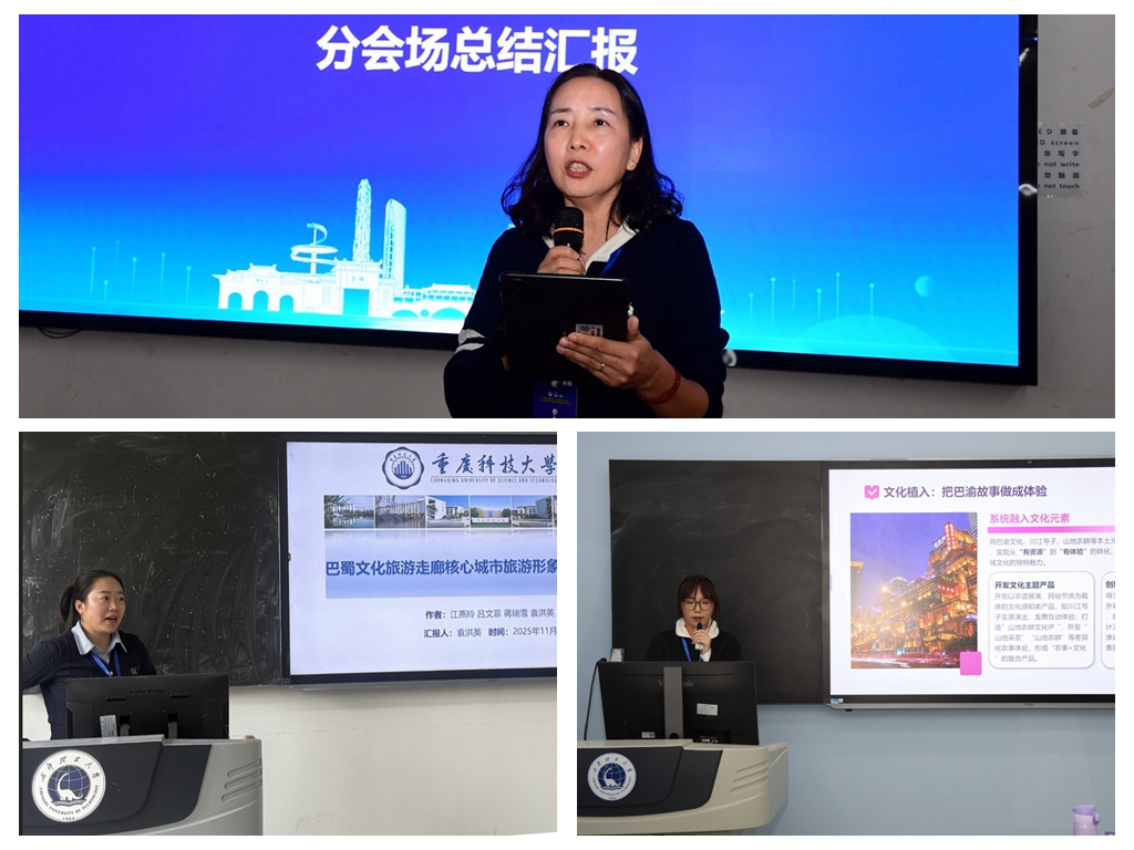 本次年会设置多个专题论坛,江燕玲教授受邀担任“农文旅融合与乡村振兴”专题论坛论坛专家点评人,结合自身研究经验,对论坛宣读的多篇论文进行点评,肯定研究价值的同时提出改进建议,其点评获得论坛主持人及参会学者认可。袁洪英博士代表研究组作《巴渝文化旅游走廊核心城市旅游形象感知对比研究》论文分享。该研究以巴渝文化旅游走廊核心城市为对象,探讨城市旅游形象感知差异及形成机制,为区域旅游协同发展提供参考,引发参会学者关注与讨论。此外,我校旅游管理专业学生戴雅钦也分享了《多维度视角下重庆市农家乐同质化表征与差异化策略研究》论文。