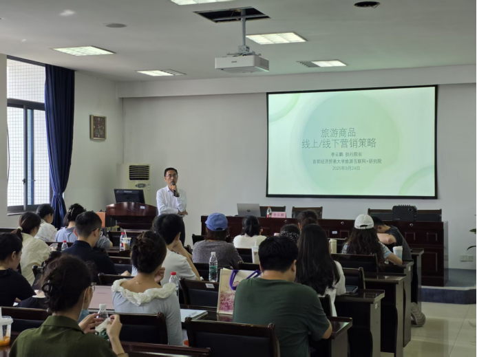 【供稿/管理学院 李龙晓】为推动旅游管理学科建设,拓宽师生在智慧文旅领域的学术视野,9月24日,首都经济貿易大学李云鹏教授应邀做客管理学院创新管理论坛,并在博学楼F312会议室作了题为“旅游商品(基地)线上线下运营”的专题讲座。讲座由管理学院MTA中心主任李强教授主持,管理学院60余名师生参会交流。