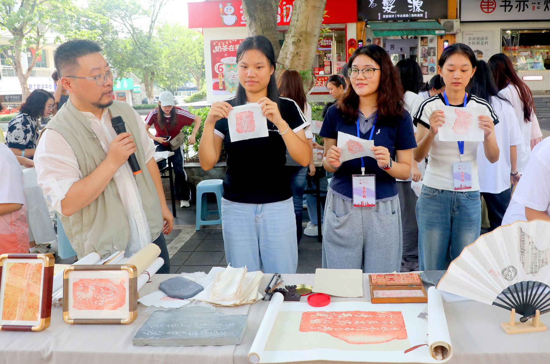 活动现场张灯结彩、热闹非凡,处处洋溢着浓厚的节日氛围。在“烽火忆昔·情暖中秋”环节中,师生们穿越时光长廊,共忆峥嵘岁月,通过朗诵、飞花令、诵读家书家训和讲故事等形式,表达“露从今夜白,月是故乡明”的乡愁与“但愿人长久,千里共婵娟”的美好祝愿。金石拓印台前,“绘印佳节”环节以朱砂为墨、素纸为舟,一方方古韵斑驳的印章在师生手中复现“金石永寿”的文明印记。投壶区羽箭破空,“矢志守心”的呼喝声此起彼伏,传统礼仪与青春热血在欢声笑语中交融共鸣,“君子之争,必也射乎”的庄重被赋予了新的活力。“月圆谜趣”环节以诗为谜,灯谜轻悬似星罗,参与者或蹙眉沉思,或恍然大悟,在字里行间探寻“举杯邀明月”的诗意与“月上柳梢头”的浪漫;棋盘之上“弈局见智”,师生以棋会友,于方寸之间碰撞思维火花,在攻守进退间体悟人生智慧。