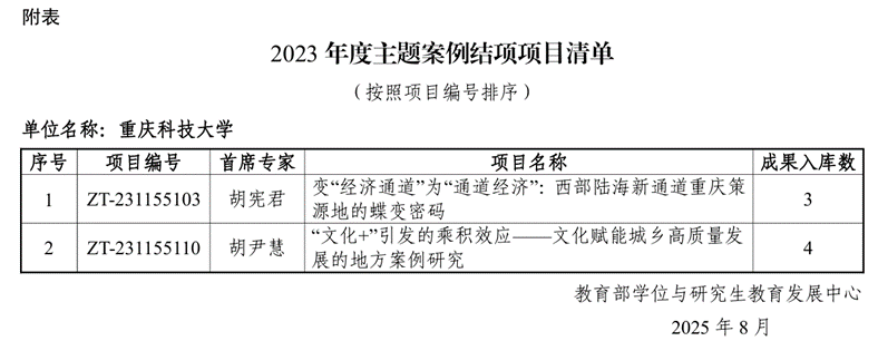 我校本次结项的两项主题案例分别为:管理学院胡尹慧主持的《“文化+”引发的乘积效应——文化赋能城乡高质量发展的地方案例研究》,完成4篇案例成果,展现了文化赋能在乡村振兴、社区治理、公共文化服务和城市更新中的创新实践,也为各地探索“文化+”模式提供了可复制的经验;管理学院胡宪君主持的《变“经济通道”为“通道经济”:西部陆海新通道重庆策源地的蝶变密码》,完成3篇案例成果,为深入理解国家战略与地方实践互动提供了鲜活样本。上述成果均已通过专家评议,拟正式入库,面向全国推广使用。
