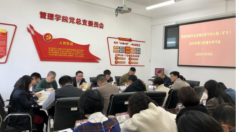 10月30日,管理学院党总支理论学习中心组(扩大)围绕“深学细悟党的二十届四中全会精神,以高质量规划,促高质量发展”主题,在博学楼F310会议室开展第13次集中学习会。学校党委常委、组织部部长李加强列席旁听并指导,学校列席旁听第3组成员、学校巡察组组长熊书银列席会议,学院理论学习中心组成员、组织员、院长助理、党支部书记、系(中心)负责人、科级干部、党务干部参加学习。会议由学院党总支书记李旭东主持。