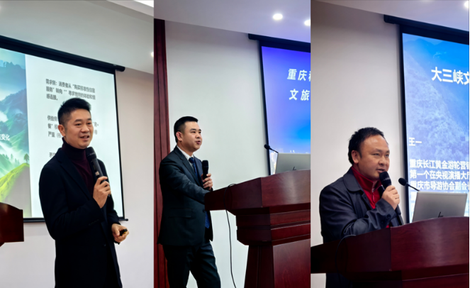 在交流研讨环节,校外导师结合自身丰富的行业经验,分享了高屋建瓴的行业洞察及落地可行的实践建议,为破解人才培养难题、深化校企合作提供了重要思路。重庆莱信文化旅游发展有限公司执行董事张涛、重庆新发现全域旅游规划设计有限公司总经理黄昌琪、重庆文旅集团重庆长江黄金游轮公司市场营销分公司副总经理王一三位资深专家,围绕行业热点与创新实践进行了精彩分享。