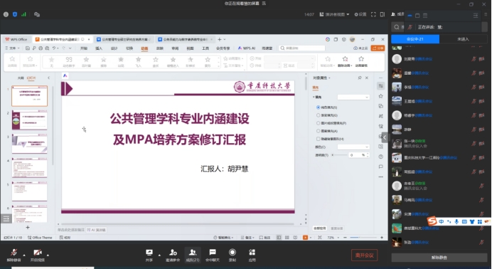 MPA教育中心办公室主任胡尹慧就公共管理学科专业内涵建设及MPA培养方案的修订背景、学科方向凝练、课程体系优化、实践能力提升、微专业建设初步设想进行了详细汇报。同时,围绕学生公共服务精神、战略思维能力和数据分析素养培养的培育目标,对新增设的“智能社会治理”“公共管理研究设计与方法运用”等前沿课程模块的设置初衷、内容体系和育人价值进行了全面介绍。