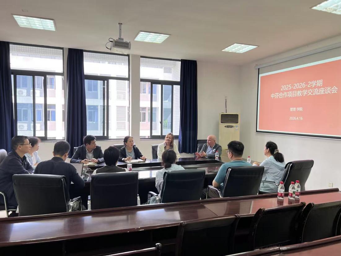 4月16日,教师座谈会在博学楼F311举行。会议由学院副院长游静主持,芬方在华授课教师、学院党政班子成员及项目组成员参会。会上,双方围绕课程体系建设、教学模式创新、中芬师资协作、学生考核评价等进行了深入研讨。芬方教师分享了学生近期学习状态与学习情况,结合自身教学实践,客观分析了教学过程中存在的不足,就深化双边教学合作、优化教学内容与方法提出了具有针对性建议。学院相关负责人认真倾听、详细记录,就芬方教师提出的建议逐一回应,明确了后续改进方向。